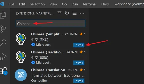 2、然后在界面中的导航栏中输入Chinese,在界面中看到中文简体之后,我们在点击“install”选项;