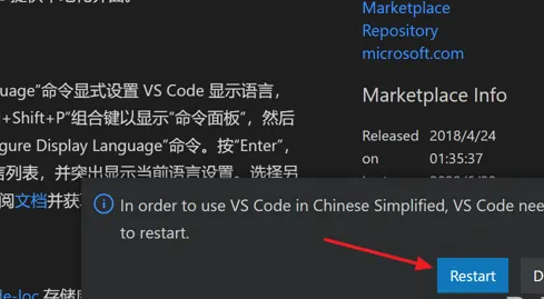 3、等到中文插件下载完成之后会有一个弹窗出来,这时候我们点击里面的“restart”重启软件;