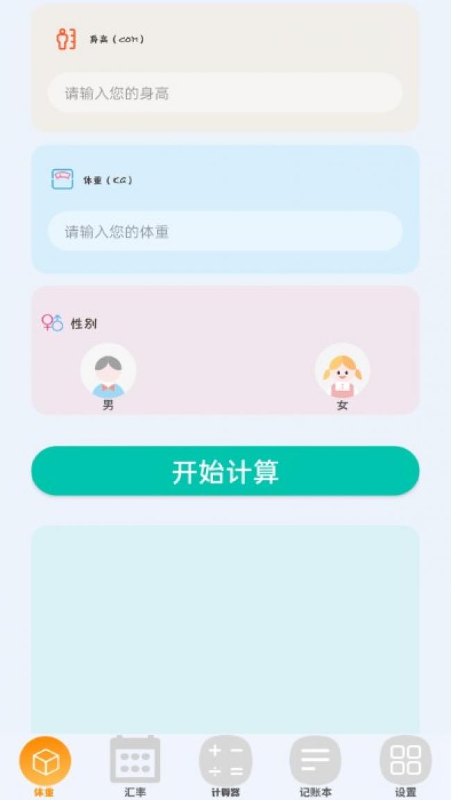 3、输入你的身高、体重,并选择你的性别,再按开始,系统将根据你目前的身体质量指数及幅度来判断你是不是要节食或是增重。