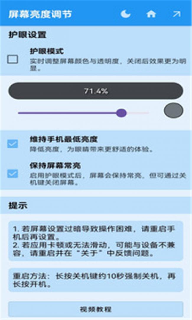 屏幕调光器APP最新版下载是一款专门为用户调节屏幕亮度的软件,在这里可以帮助用户将手机的屏幕调节成最适合自己的亮度,让你的眼睛可以不再疲劳。还可以改变你手机的背景颜色,按照用户所喜欢的底色来进行调整,让你可以更加完美地使用自己的。不仅如此这里还有超多的护眼小知识,让你可以更加健康的用眼,是一款非常值得下载的软件。