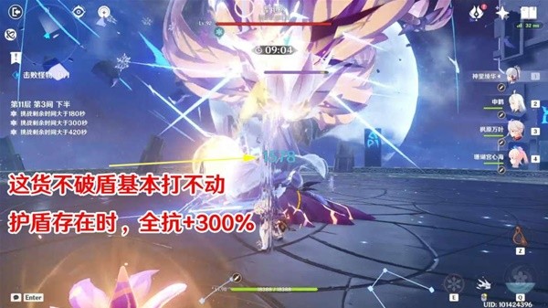 下半的掣电树(35.7万生命值),护盾期间全抗提升300%,初始弱点在花冠。冻梨带的是神鹤万心,绫华重击可以打到其花冠。当然你也可以等他20多秒后转移到根部贴脸打,没啥难度,单纯提醒一下大家别慌。