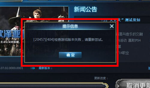 Q:打开游戏客户端后,提示无法连接更新服务器,客户端提示“[20457][404]检检查游戏版本失败,请重新尝试”(如图)