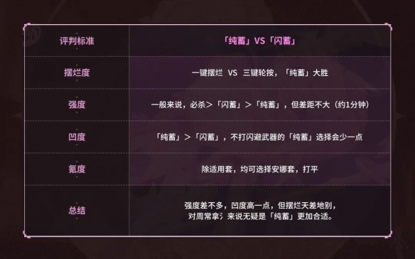 「纯蓄」与「闪蓄」都是人之律者形态下的路线,全程不开必杀。前者只需按住攻击键保持蓄力,是为「纯蓄」;后者则在武器接闪避后进行短时间蓄力,如此循环,是为「闪蓄」。