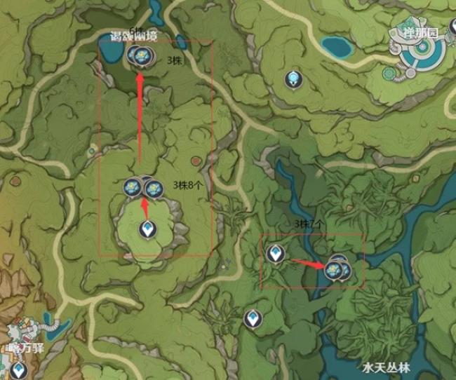 3株6个七天神像下方瀑布口(上方两个女团守着一个地上的,感觉不会刷新,没有植株,应该是一次性)