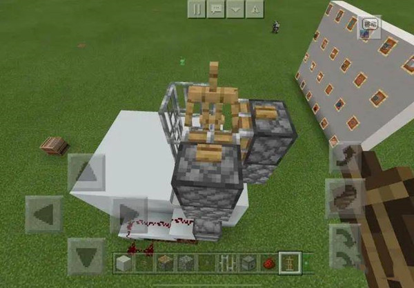 3、把地下的草块替换成发射器,中间放水桶,最上层放铁活板门。