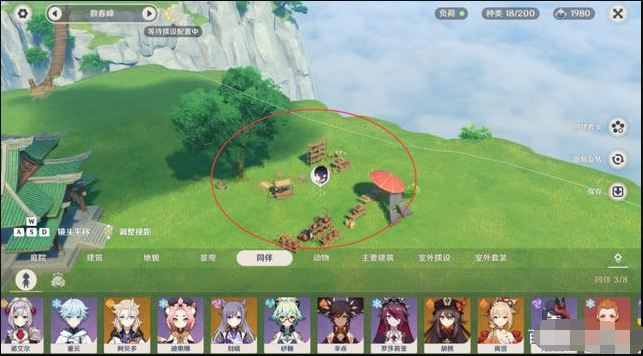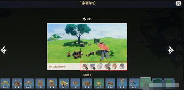 3.如果摆设道具齐全,点击套装图片,就可以把摆设套装放出来,然后在同伴选项处,把喜欢的角色放到摆设套装周围。接着保存,退出摆设界面。