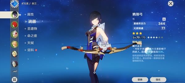 根据上述结论,我们也就可以得出夜兰主C流的武器选择推荐了。当你的夜兰以蒸发为核心时,推荐武器副词条为精通,如绝弦、鸦羽弓等;当你的夜兰以“脸白”(即暴击伤害)为核心时,推荐武器副词条为暴击或爆伤,如飞雷、弹弓等。