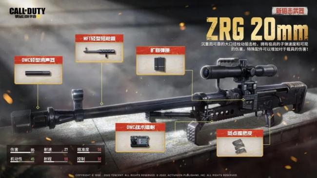 情报显示,ZRG 20mm是一把拥有可观伤害的大口径栓动狙击枪,虽然沉重,但是在使命战场中子弹速度较快,装备特殊配件还可以增加其对于载具的伤害。“口径即正义”!