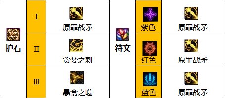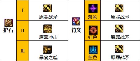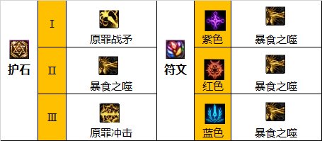 护石选择原罪战矛、暴食之噬、原罪冲击,符文紫红蓝选择暴食之噬