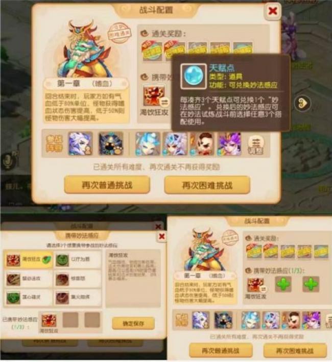 4.进入战斗前,可以选择魔法心灵感应帮助通关。每次通关都可以获得天赋点,还可以根据自己门派的特点兑换成其他魔法心灵感应。