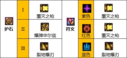 护石选择覆灭之枪、爆弹华尔兹、裂地爆刃,符文紫红选择覆灭之枪,蓝色选择裂地爆刃