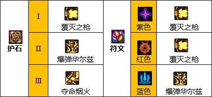 护石选择覆灭之枪、爆弹华尔兹、夺命烟火,符文紫红选择覆灭之枪,蓝色选择爆弹华尔兹