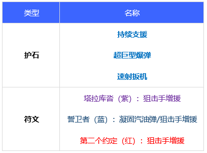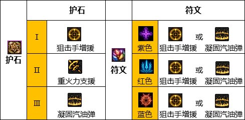 护石选择狙击手增援、重火力支援、凝固汽油弹,符文紫蓝红选择狙击手增援或凝固汽油弹