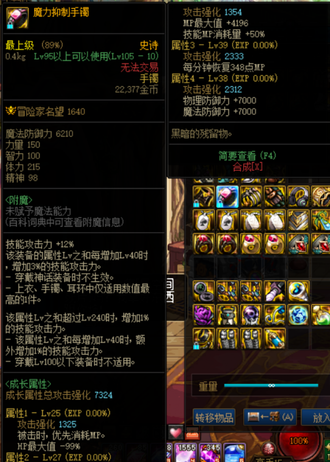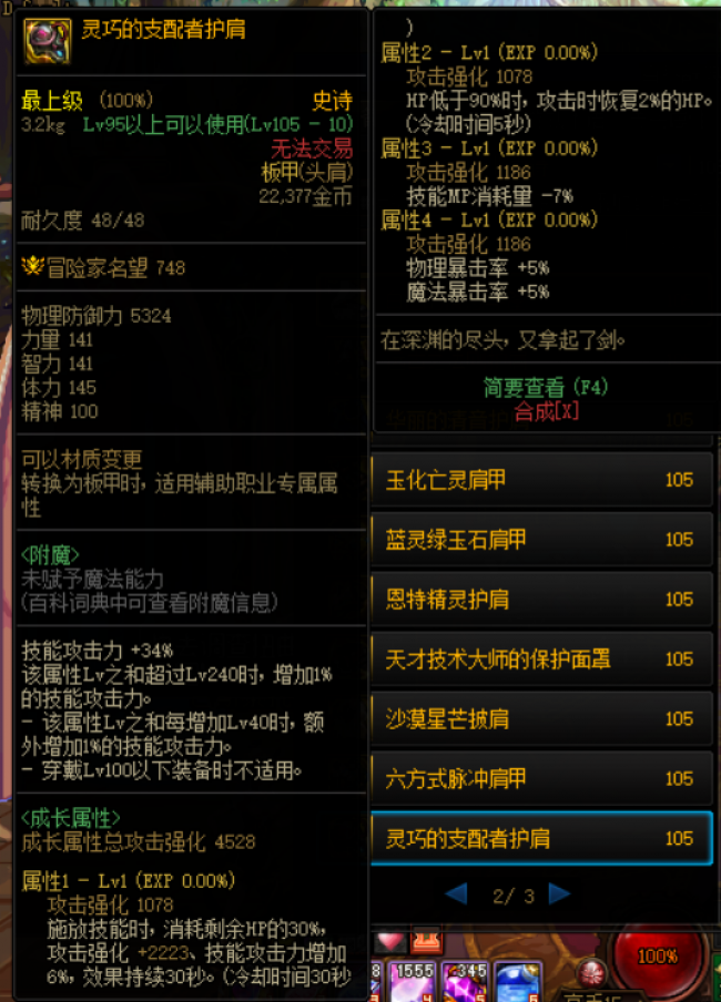3、如下图所示这件:灵巧支配者,这个装备是毁灭的寂静城的专属SS,放技能会消耗血量来强化攻击和技能攻击,同时减低MP的消耗。能够结合输出与生存能力,还能够快速的压低血量,是核心散件之一