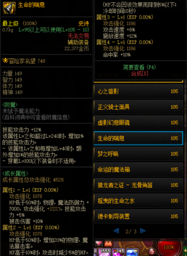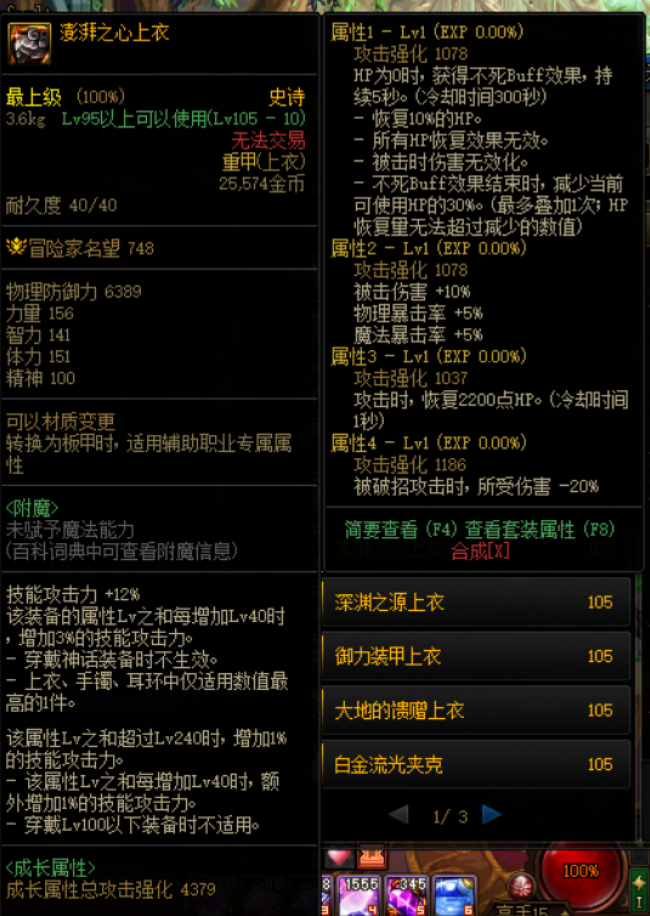这件装备可以有效提高容错率,其实像这种类似的装备还有“双面星云皮大衣”:血量为0时用MP替代,HP不能回复,攻击可以回复MP,“死亡蚕食胸甲”:血量为0时进入狂暴状态可以增加伤害,狂暴状态结束后死亡。