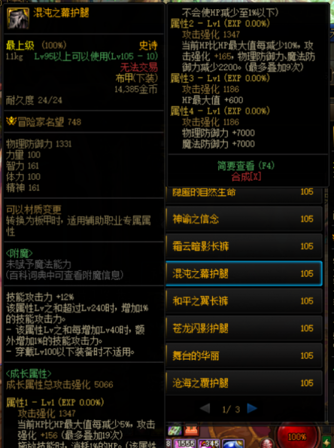 二、流派次核心的选择如下图所示:混沌之幕护腿,这件装备在低血时可以强化攻击,血量越低的话层数也就越多。 可以搭配魔衣压制手镯或者其他核心,可以快速触发到满层的效果,是次核心首选。