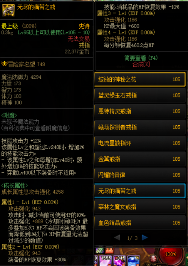 下面这件呢,无尽的痛苦之戒,也是消耗血量来增加攻击,叠加层数, 就是有个负面效果,降低消耗品的回复效果,需要经常吃药来保证MP的足够,次核心的可选装备