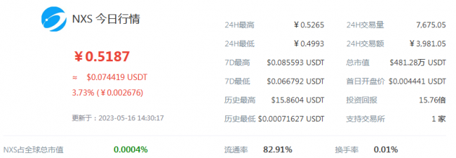 今日24小时候内涨幅是-4.07,24小时候内最高价格是¥0.4942元人民币,24小时候内最低价格是¥0.47元人民币,24小时候内成交量是24023.1NXS,24小时候内成交额是11396.82,NexusNXS总市值为3514.66万。