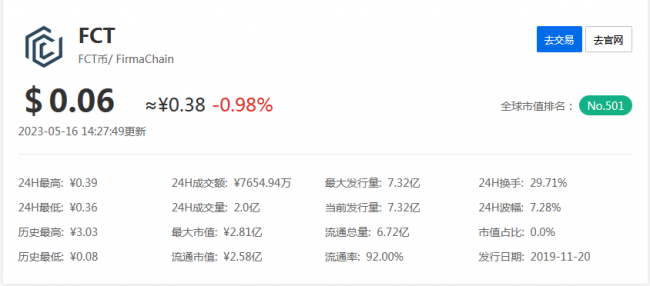 根据CoinMarketCap的数据,截至2023年5月16日,FCT的价格为每个代币约0.085美元,市值约为3,888,785美元,排名第1287位。