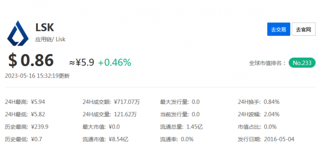 今日24小时候内涨幅是0.49,24小时候内最高价格是¥5.8487元人民币,24小时候内最低价格是¥5.8127元人民币,24小时候内成交量是119.74万LSK,24小时候内成交额是703.09万,应用链LSK总市值为7.57亿。